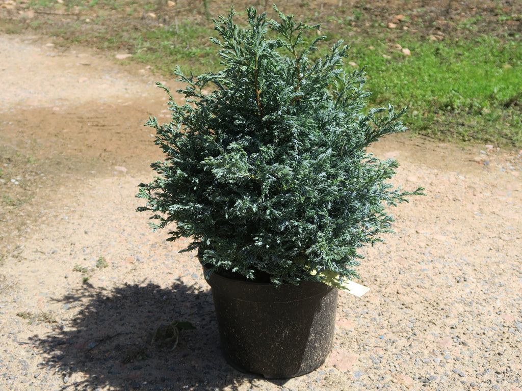 DESCRIPCIÓN VISUAL: Conífera de porte cónico y compacto, con follaje denso de color azul plateado. Las hojas son pequeñas, escamosas y se disponen en ramas que pueden arquearse ligeramente.