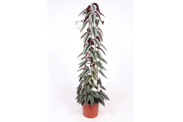 DESCRIPCIÓN VISUAL: Planta trepadora con hojas de textura aterciopelada y patrones de color verde oscuro y plateado en el haz, y tonos rojizos en el envés. Produce pequeñas flores agrupadas en inflorescencias.