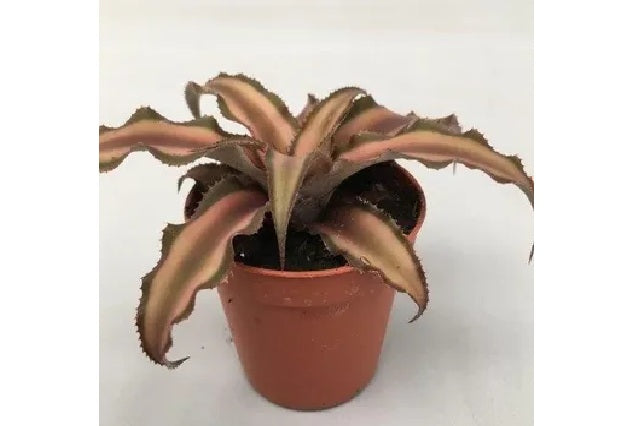 DESCRIPCIÓN VISUAL: Planta de interior con hojas en forma de roseta, con bandas de color verde oscuro y líneas paralelas más claras. Puede presentar tonos rosados o rojizos.
