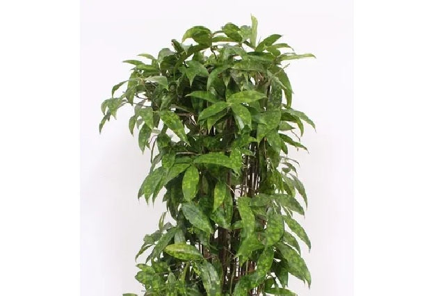 DESCRIPCIÓN VISUAL: Planta perenne con tallos leñosos y hojas ovaladas de color verde oscuro con manchas amarillas o blancas que parecen salpicaduras de pintura.