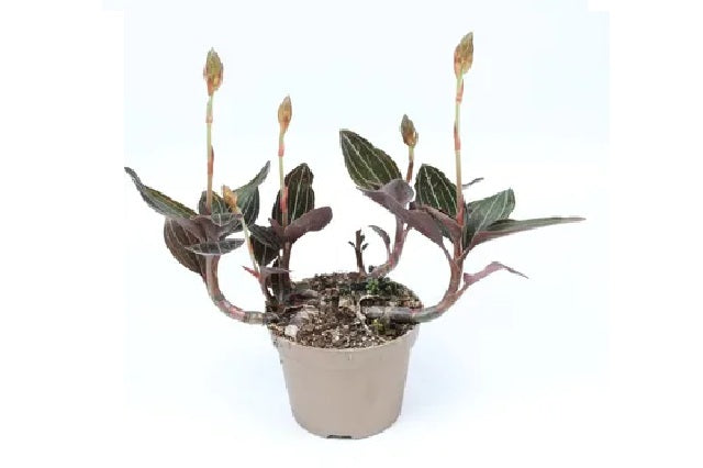 DESCRIPCIÓN VISUAL: Orquídea terrestre con hojas aterciopeladas de color verde oscuro y vetas púrpura o rojizas. Produce pequeñas flores blancas con un toque de amarillo o rojo en el centro.