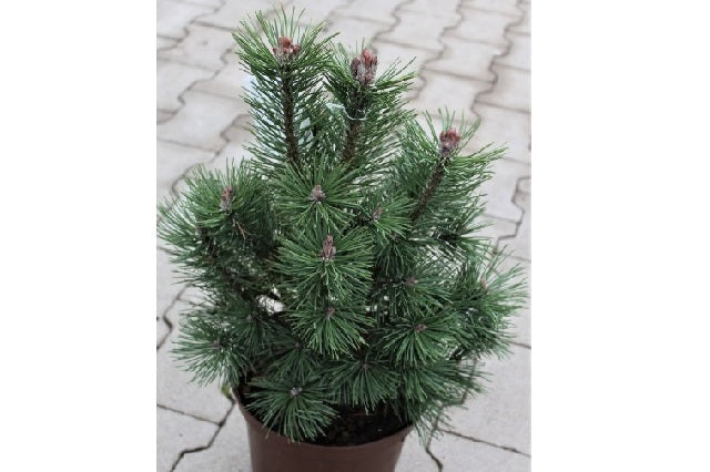 DESCRIPCIÓN VISUAL: Conífera de porte arbustivo o pequeño árbol, con copa densa y ramas extendidas. Las agujas son de color verde oscuro, rígidas y aparecen en pares. Los conos son pequeños y de color marrón.