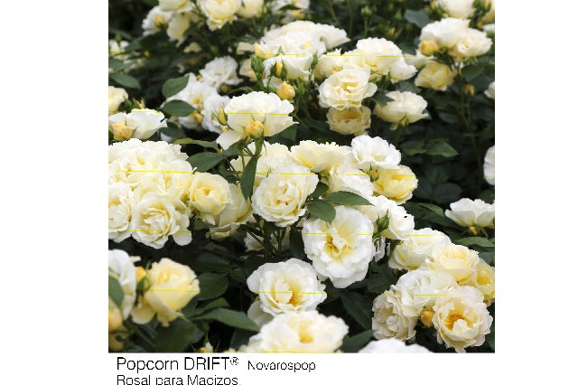 DESCRIPCIÓN VISUAL: El Rosal 'Popcorn Drift' es conocido por sus pequeñas flores de color amarillo crema que se aclaran a blanco. Tiene un hábito de crecimiento compacto y rastrero, con follaje verde oscuro y brillante.
