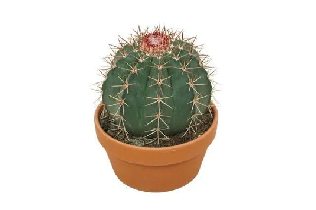 DESCRIPCIÓN VISUAL: Cactus de forma globular con costillas pronunciadas y espinas radiales. Presenta un cefalio lanoso de color marrón o rojo en su parte superior, donde se desarrollan las flores.