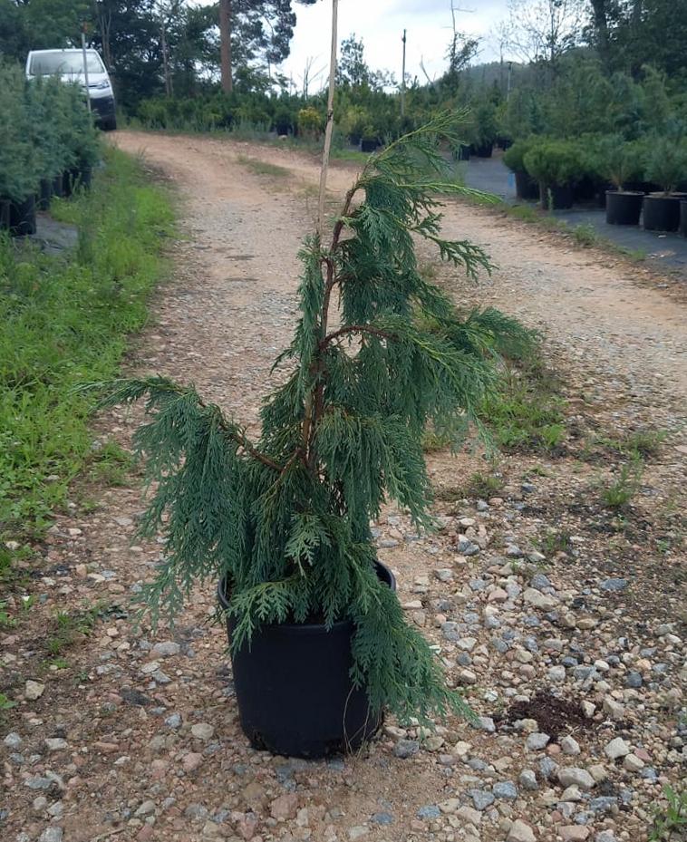 DESCRIPCIÓN VISUAL: Árbol perenne con forma cónica y ramas colgantes. Las hojas son escamosas, de color verde oscuro. Produce pequeños conos redondos.