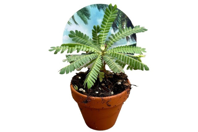 DESCRIPCIÓN VISUAL: Planta herbácea pequeña con hojas compuestas que se pliegan al tacto. Posee flores amarillas y un tallo central desde donde se desprenden las hojas.