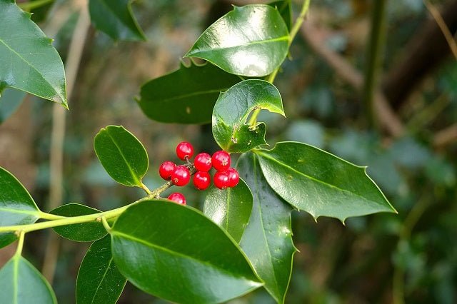 DESCRIPCIÓN VISUAL: Arbusto o pequeño árbol de hojas perennes, brillantes y de bordes menos espinosos que otras variedades de acebo. Produce bayas rojas en otoño e invierno.