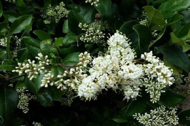 DESCRIPCIÓN VISUAL: Arbusto o pequeño árbol perenne con hojas de color verde oscuro y brillante. Produce flores blancas en racimos y bayas negras o azuladas en otoño.