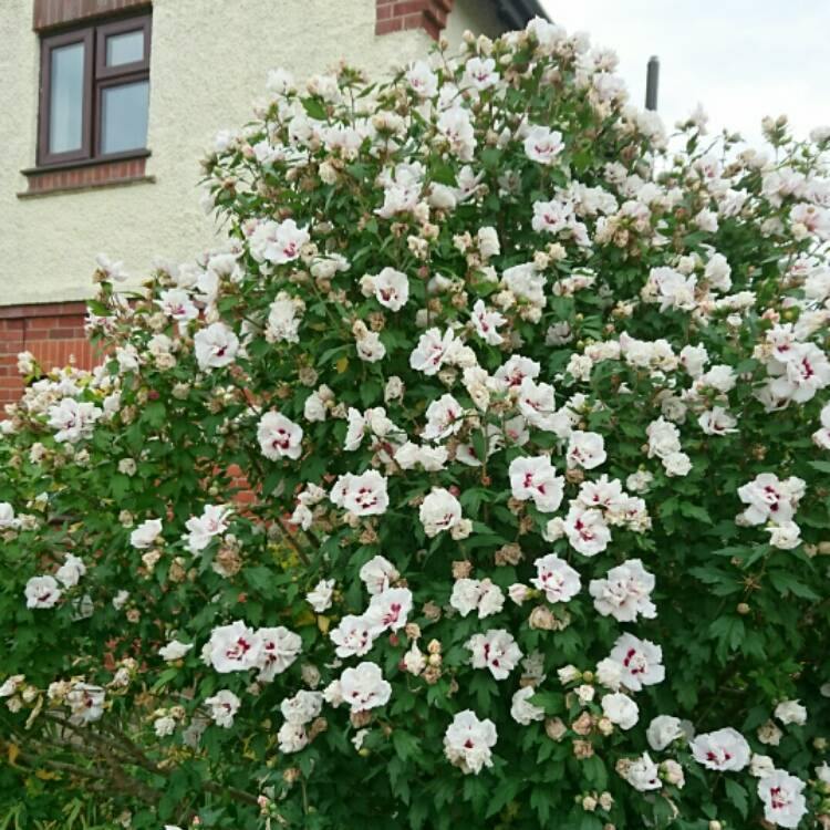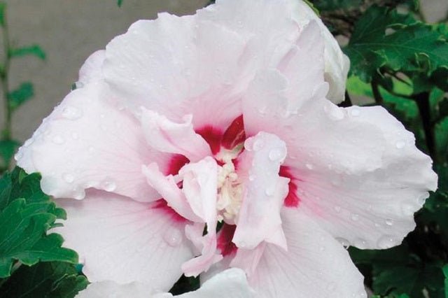 DESCRIPCIÓN VISUAL: Arbusto caducifolio con flores dobles de color blanco matizado con rosa y un centro rojo oscuro. Alcanza hasta 3 metros de altura y presenta hojas verdes en forma de diamante.