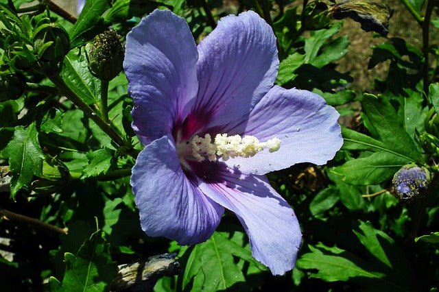 DESCRIPCIÓN VISUAL: Arbusto caducifolio con flores grandes y vistosas, generalmente de color blanco, rosa, rojo o lila, con un centro oscuro. Las hojas son verdes y con forma de diamante o ligeramente lobuladas.