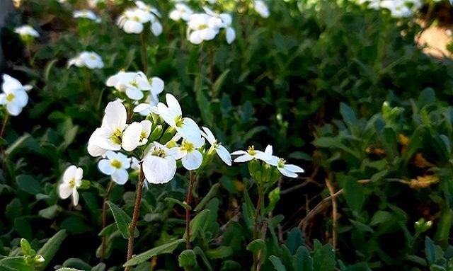 DESCRIPCIÓ VISUAL: Planta herbàcia perenne amb fulles basals en roseta, de color verd fosc. Produeix ramells de flors blanques o lleugerament rosades amb quatre pètals.