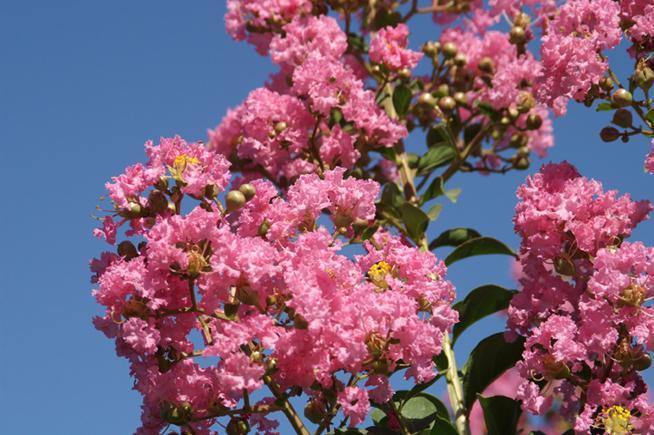 DESCRIPCIÓN VISUAL: Árbol o arbusto caducifolio con flores de color rosa intenso. Posee una corteza exfoliante que revela un tronco liso y marrón claro. Las hojas son pequeñas, ovaladas y de color verde oscuro.