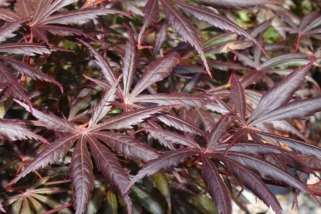 DESCRIPCIÓ VISUAL: Aquest arç japonès té fulles de color vermell fosc, gairebé porpra, que són profundament lobulades i amb els marges enrotllats cap avall. A la tardor, les fulles es tornen a un vermell brillant.