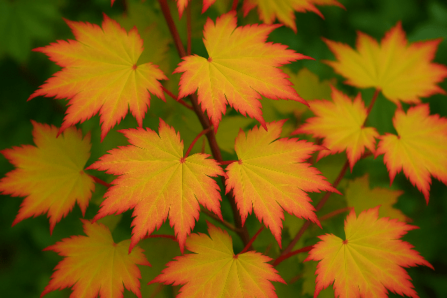 DESCRIPCIÓ VISUAL: Aquest arç japonès és conegut pels seus cridaners talls vermells corall, especialment notables a l'hivern. Té fulles palmades de color verd clar que es tornen a tons grocs, taronges i vermells a la tardor.