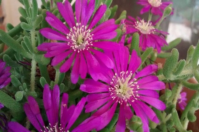DESCRIPCIÓN VISUAL: Planta suculenta con tallos colgantes y hojas carnosas de color verde. Las flores son pequeñas y de colores brillantes, generalmente rosas o púrpuras.
