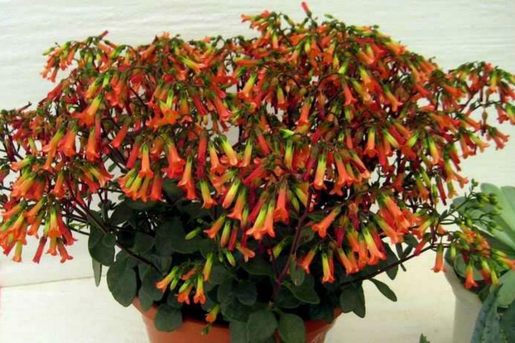 DESCRIPCIÓN VISUAL: Planta suculenta con hojas carnosas de color verde claro y bordes ondulados. Produce racimos colgantes de flores en forma de campana de color rojo a rosado.