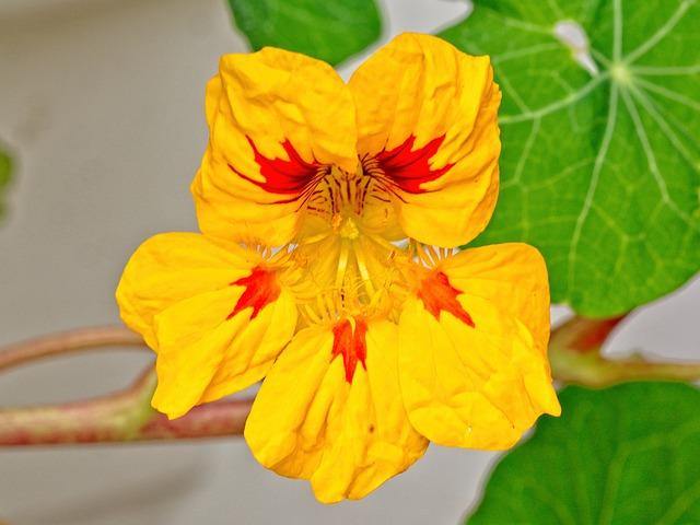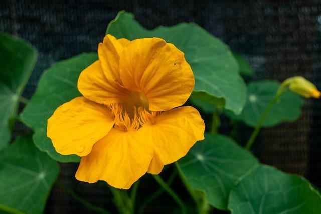 DESCRIPCIÓN VISUAL: Planta herbácea con tallos rastreros o trepadores. Hojas redondas y verdes con un peculiar escudo central. Flores en forma de embudo con cinco pétalos, comúnmente de colores vivos como amarillo, naranja o rojo.