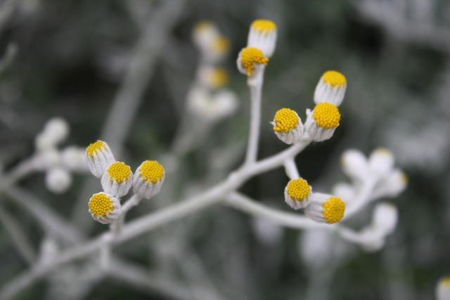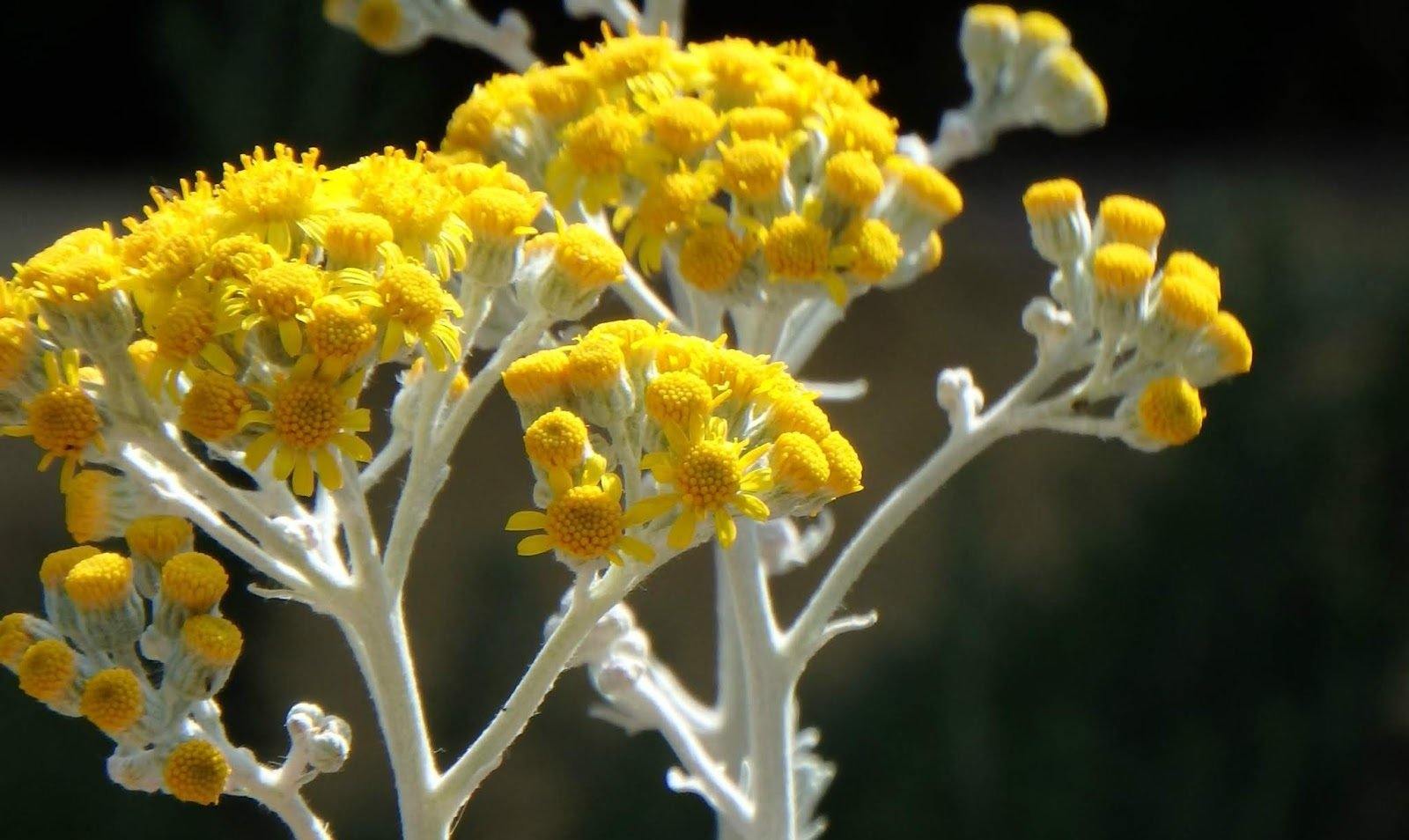 DESCRIPCIÓN VISUAL: Planta herbácea perenne con hojas plateadas aterciopeladas y flores agrupadas en capítulos de color amarillo.