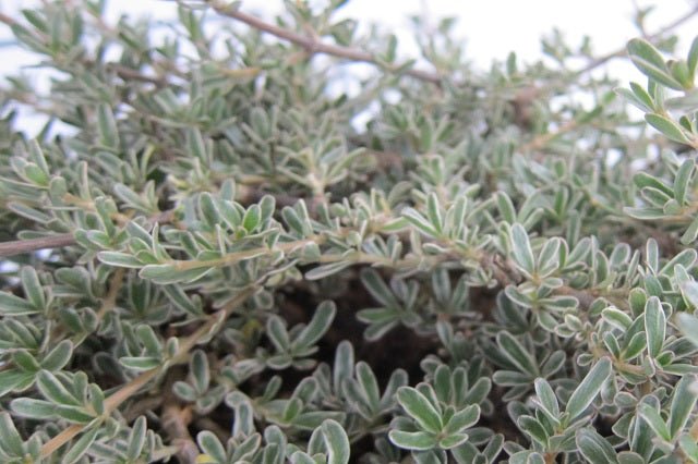 DESCRIPCIÓN VISUAL: Arbusto de crecimiento bajo con hojas pequeñas, ovaladas y brillantes. Las hojas tienen un margen irregular de color crema o blanco, contrastando con el verde oscuro del centro.