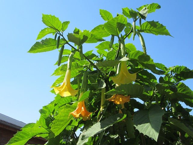 DESCRIPCIÓN VISUAL: Planta herbácea de tallo erecto y ramificado, con hojas grandes y flores en forma de trompeta de color amarillo pálido, que desprenden un olor dulce y suave.