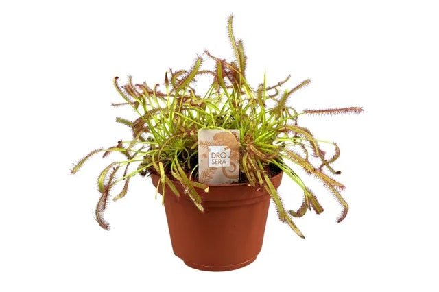 DESCRIPCIÓN VISUAL: Planta carnívora con hojas largas y estrechas cubiertas de tentáculos rojos glandulares que exudan una sustancia pegajosa que atrae a los insectos.