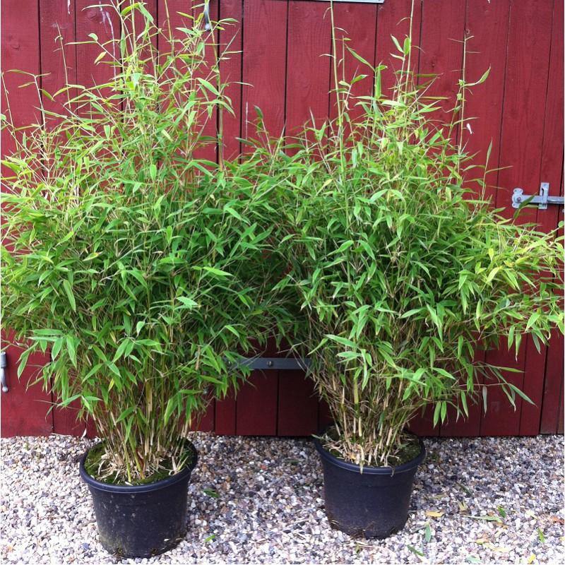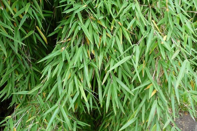 DESCRIPCIÓN VISUAL: Bambú no invasivo con tallos verdes que se vuelven amarillos con la edad. Hojas estrechas y lanceoladas de color verde oscuro.