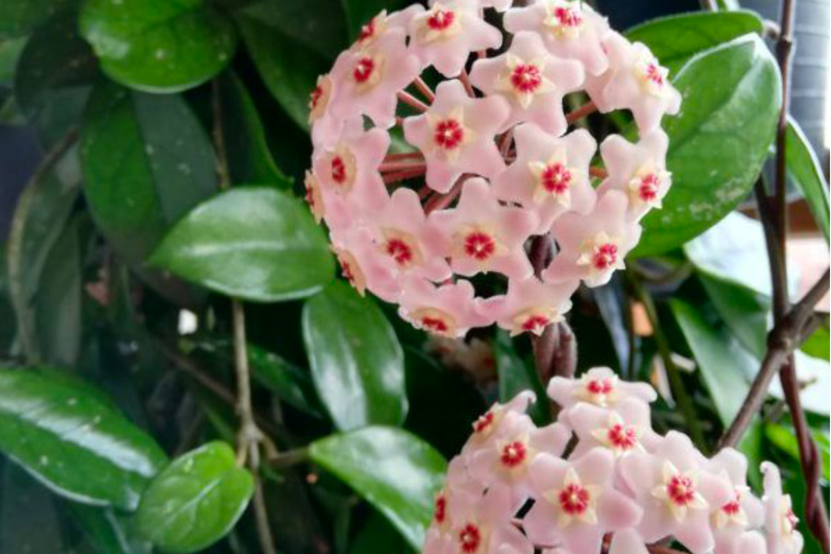 DESCRIPCIÓN VISUAL: Planta trepadora con hojas gruesas, carnosas y brillantes de color verde oscuro. Las flores son en forma de estrella, agrupadas en umbelas, con una textura cerosa y de color blanco o rosado con un centro coronado por una estrella más pequeña.