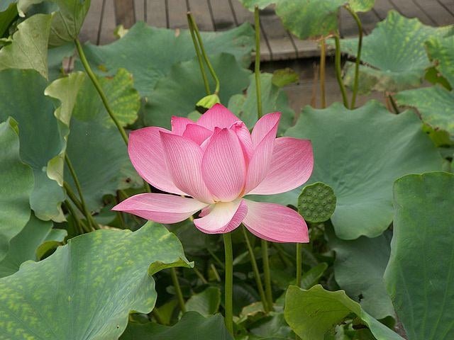 Planta aquàtica coneguda amb els altres noms comuns de lotus sagrats, lotus indis o rosa del Nil. És de l'espècie Nelumbo nucifera, pertanyent a la família botànica Nelumbonaceae. De fulles flotants, de color glauc, i amb un diàmetre de fins a 100cm. Produeix grans flors que s'eleven fins a 60 cm per sobre de l'aigua. La floració es produeix a l'estiu entre els mesos de maig a setembre. Ubicar a ple sol, si és possible durant tot el dia.