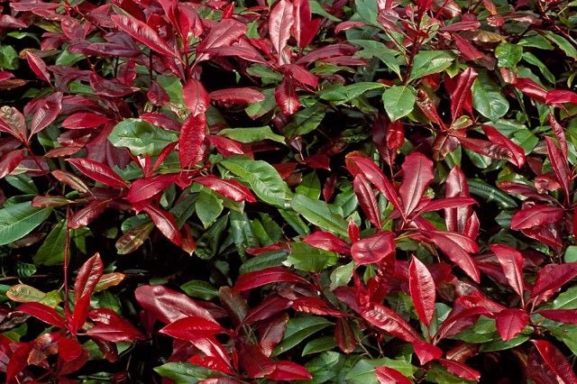 DESCRIPCIÓN VISUAL: Arbusto perenne con hojas brillantes de color verde oscuro. Las nuevas hojas emergen con un color rojo intenso, ofreciendo un contraste llamativo. Produce pequeñas flores blancas en primavera.