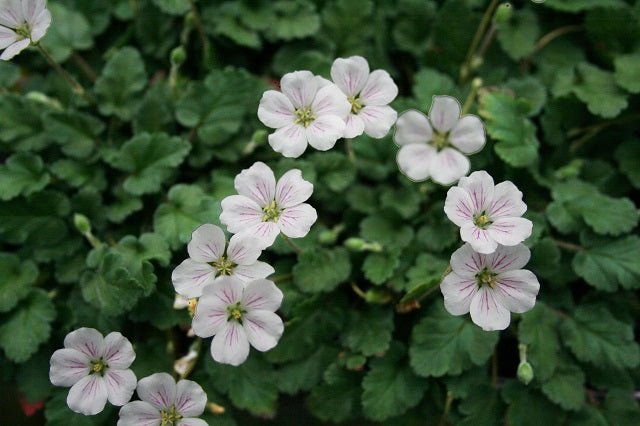 DESCRIPCIÓN VISUAL: Planta herbácea perenne de pequeño tamaño con hojas verdes, redondeadas y ligeramente peludas. Produce flores de cinco pétalos, generalmente de color blanco o rosa pálido, con venas más oscuras y un pico central característico de los frutos. VP