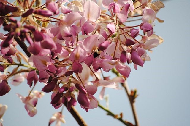 DESCRIPCIÓN VISUAL: Planta trepadora con racimos colgantes de flores de color rosa pálido. Hojas compuestas verdes y vainas de semillas marrones en otoño.
