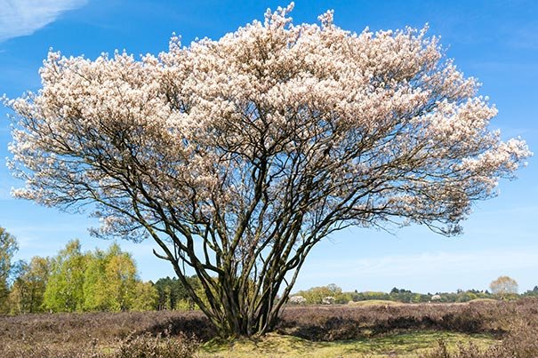 DESCRIPCIÓN VISUAL: Arbusto o pequeño árbol caducifolio con flores blancas en racimos y frutos que maduran a un color púrpura oscuro. Hojas ovaladas que cambian a tonos rojizos en otoño.
