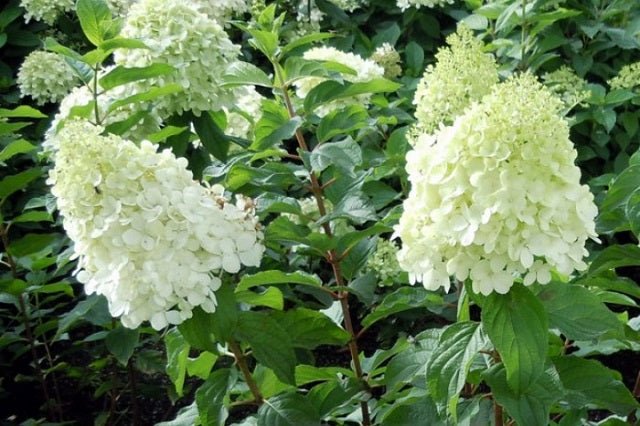 DESCRIPCIÓN VISUAL: Arbusto caducifolio con grandes inflorescencias conicas de color blanco cremoso que pueden tornarse rosadas con el tiempo. Hojas verdes ovaladas y dentadas.