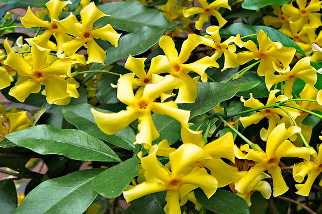 DESCRIPCIÓN VISUAL: Enredadera perenne con hojas ovaladas y brillantes de color verde oscuro. Produce flores en forma de estrella de color amarillo pálido a blanco con un aroma dulce y penetrante.