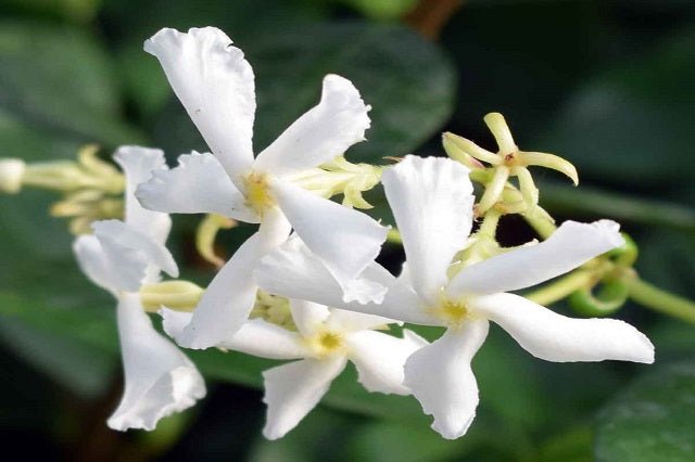 DESCRIPCIÓN VISUAL: Planta trepadora perenne con hojas ovaladas y brillantes de color verde oscuro. Produce flores blancas en forma de estrella con un aroma dulce y penetrante.