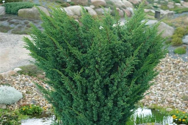 DESCRIPCIÓN VISUAL: Arbusto conífero de porte cónico y compacto. Presenta hojas en forma de aguja de color azul-verdoso y produce bayas de color azul oscuro.