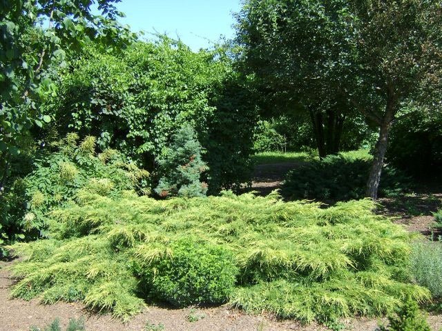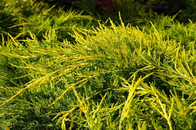DESCRIPCIÓN VISUAL: Arbusto conífero de porte extendido y follaje denso. Las hojas son aciculares y escamosas, de color verde dorado, especialmente brillantes en la nueva vegetación.