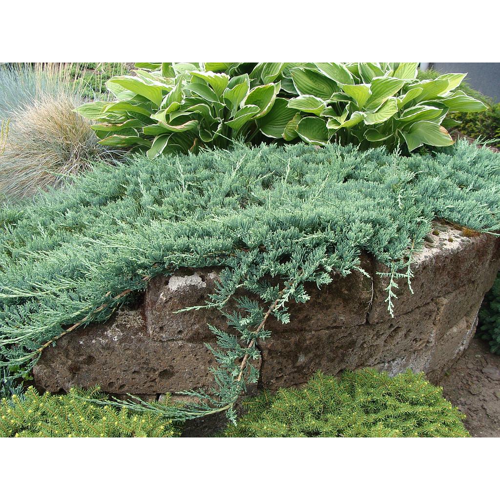 DESCRIPCIÓ VISUAL: Conífera rastrera amb branques esteses horitzontalment. Posseeix fulles en forma d'escates de color blau platejat. Arriba a una alçada de 15-30 cm i s'estén fins a 2 metres d'amplada.