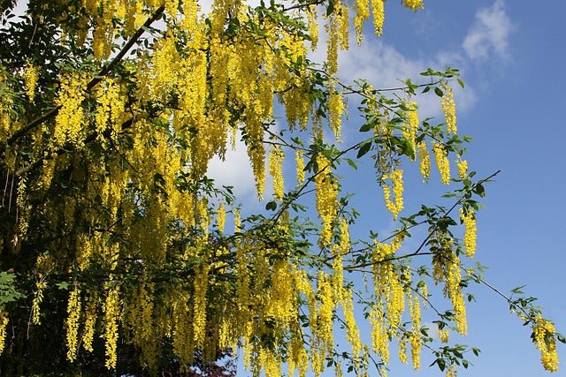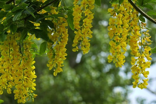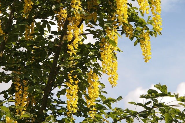 DESCRIPCIÓN VISUAL: Árbol caducifolio de tamaño pequeño a mediano con hojas trifoliadas de color verde oscuro. Destaca por sus racimos colgantes de flores amarillas brillantes que aparecen en primavera.