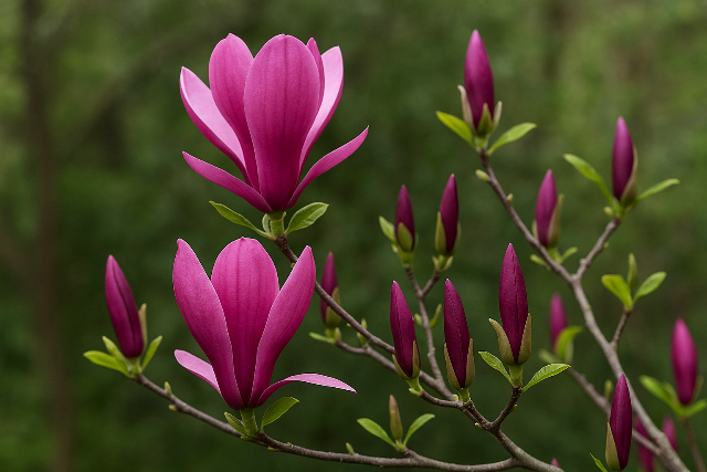 Petit arbre o arbust presentat en diversos formats - També se'l coneix com Magnòlia lliri o Magnòlia japonesa tot i que és originària del sud-est de la Xina - Arriba a alçades de quatre metres - Bella floració de flors roses amb tocs vermells i porpres - La flor apareix abans que les fulles -