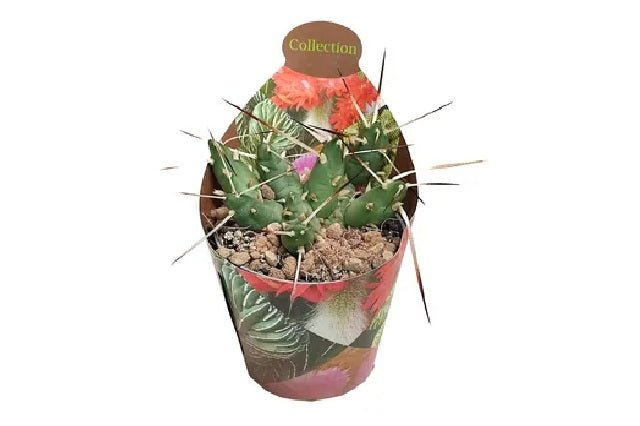 DESCRIPCIÓN VISUAL: Cactus de pequeño tamaño, globoso a cilíndrico, con tubérculos prominentes y espinas gruesas y cortas. Color verde oscuro con flores amarillas o rojas.