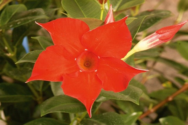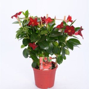 DESCRIPCIÓN VISUAL: La Mandevilla 'Rio Deep Red' es una planta trepadora con flores de un rojo intenso y profundo. Sus hojas son de color verde oscuro, brillantes y tienen una forma ovalada. Las flores son en forma de trompeta y pueden alcanzar hasta 7-10 cm de diámetro.