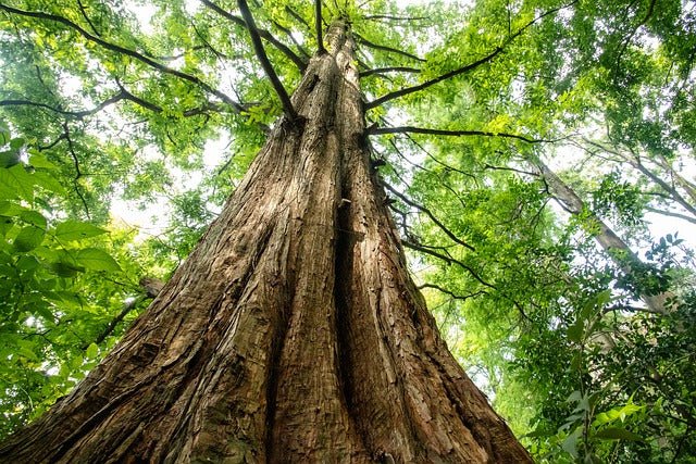 DESCRIPCIÓN VISUAL: Árbol caducifolio de gran tamaño, con una altura que puede superar los 30 metros. Posee una corteza de color rojizo-marrón que se desprende en tiras. Sus hojas son planas, delgadas y de color verde claro, que se tornan marrón cobrizo en otoño.