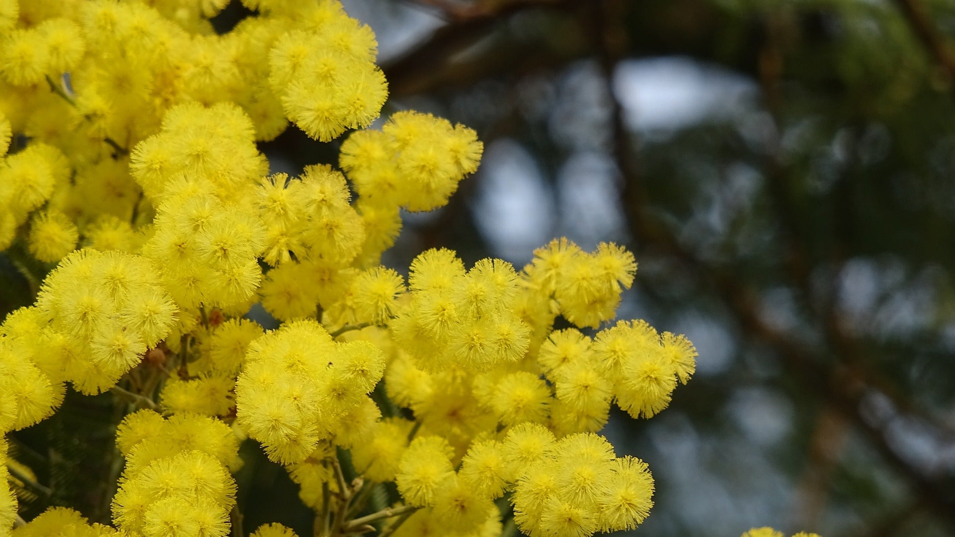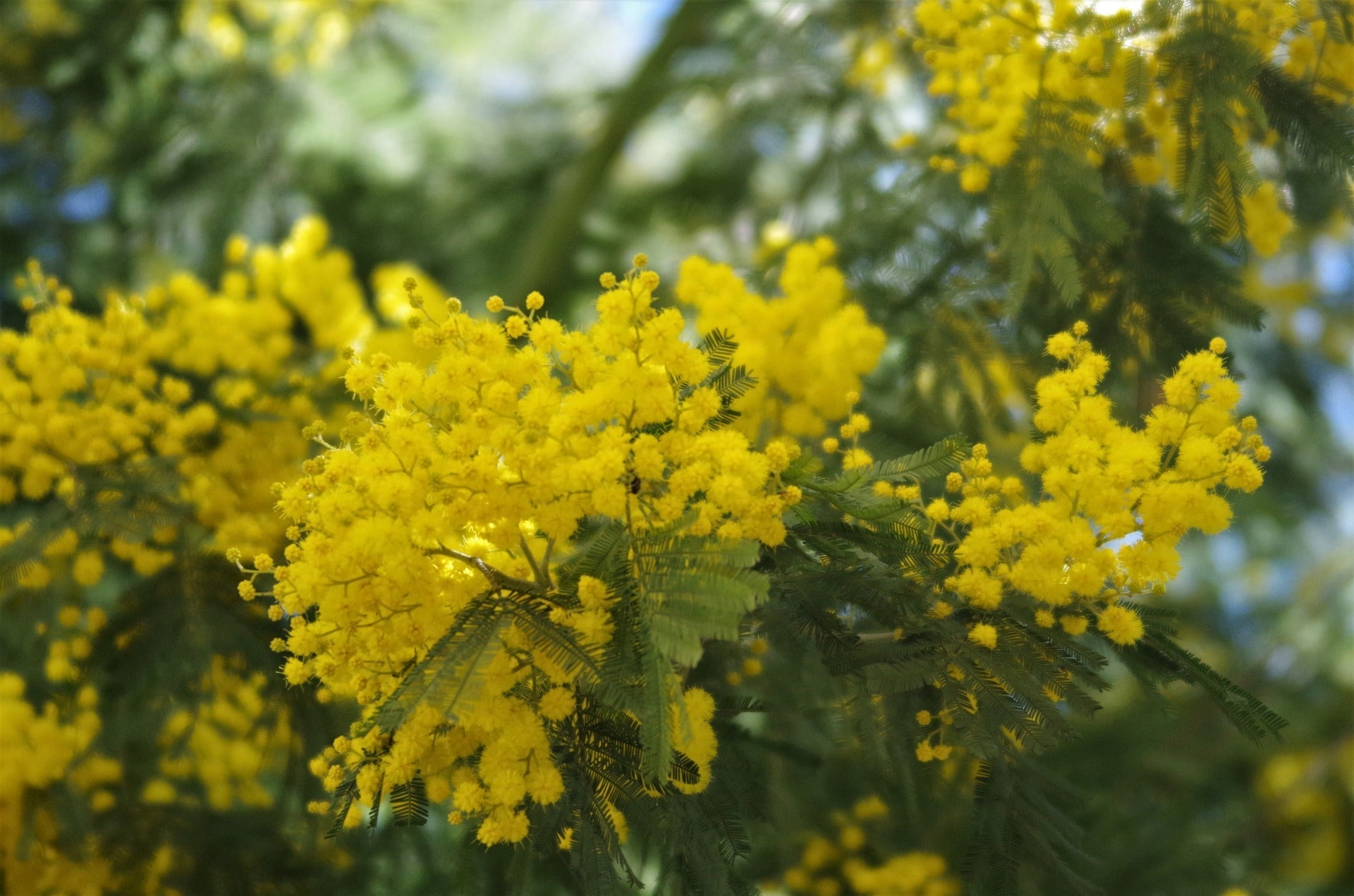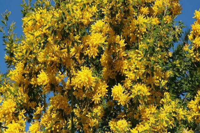 DESCRIPCIÓ VISUAL: Arbre de port petit a mitjà amb fulles bipinnades de color verd grisenc i flors en densos raïms de color groc brillant.