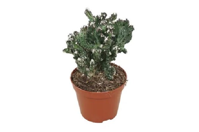 DESCRIPCIÓN VISUAL: Cactus de crecimiento columnar con tallos que se dividen y crecen en formas onduladas y crestadas. Presenta un color verde claro con zonas más claras o amarillentas donde se forman las crestas.