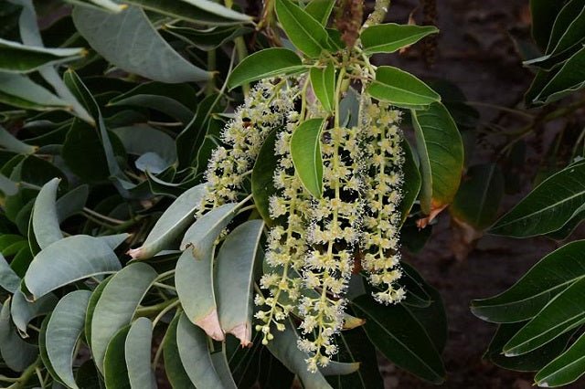 DESCRIPCIÓ VISUAL: Arbre de gran port amb un tronc gruixut i esponjós, copa àmplia i fulles grans, verdes i brillants. Produeix petites flors blanques agrupades en raïms, seguides de baies negres.