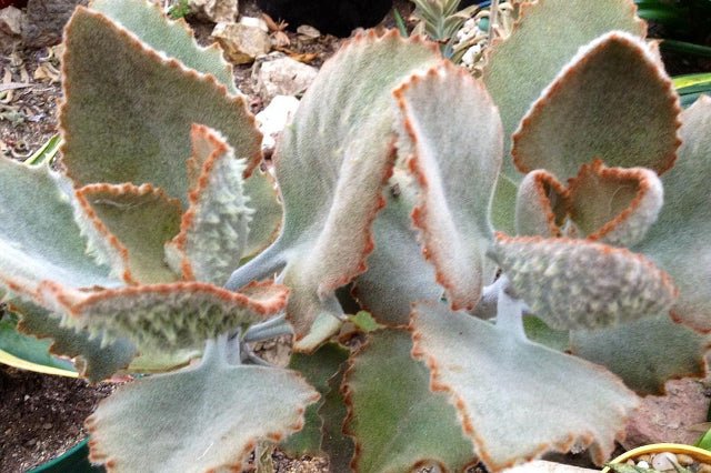 DESCRIPCIÓ VISUAL: Planta suculenta amb fulles grans, carnoses i de color verd grisenc, amb una textura vellutada i vores ondulades. Pot assolir alçades considerables, amb un hàbit de creixement arbustiu.