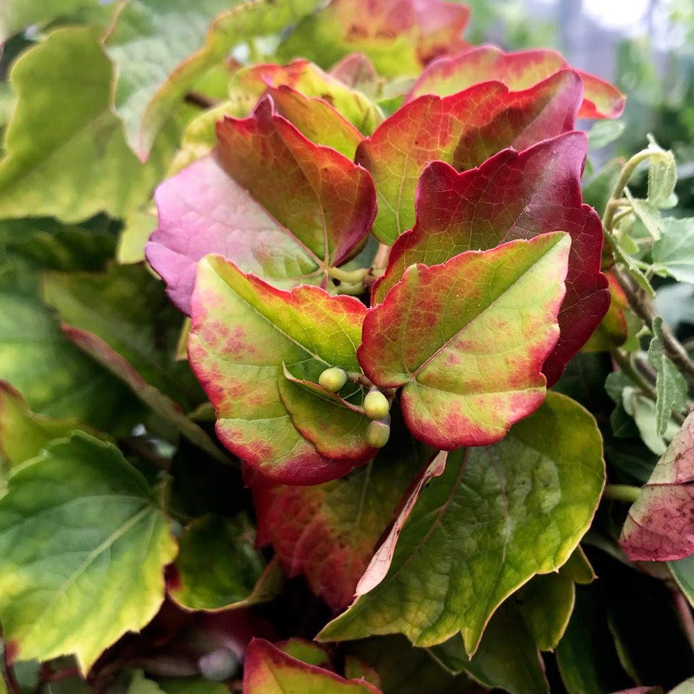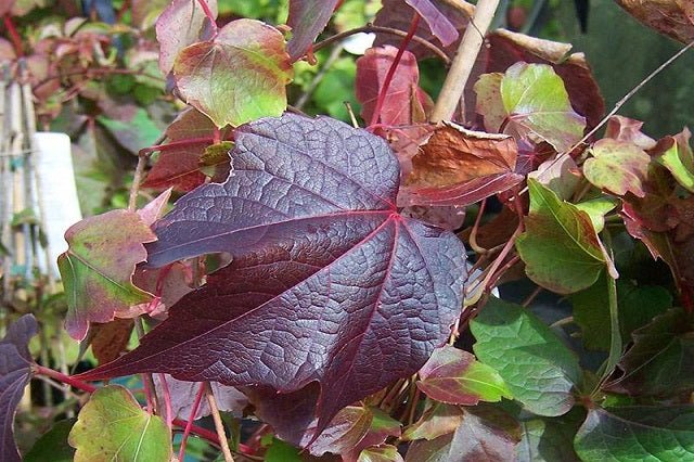 Descripción visual: El Parthenocissus tricuspidata ‘Veitchii’ es una planta trepadora decidua y vigorosa. Sus hojas son principalmente ovadas o trilobuladas, de un verde profundo y brillante, con un ancho de aproximadamente 15 cm. En otoño, estas hojas se transforman en tonos brillantes de carmesí, escarlata y burdeos.
