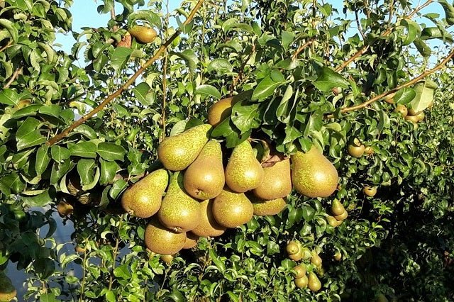 La perera Conference es distingeix pel seu fruit de forma acampanada. És una pera de color verd pistatxo i tons groguencs amb múltiples taques de color marró clar. La pell és una mica rugosa.