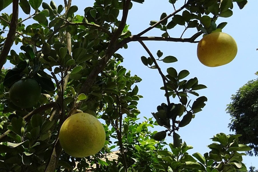 DESCRIPCIÓN VISUAL: Árbol de tamaño mediano con hojas perennes, grandes y brillantes. Los frutos son grandes, redondos y de piel gruesa, variando en color desde amarillo pálido hasta rosado o rojo dependiendo de la variedad.